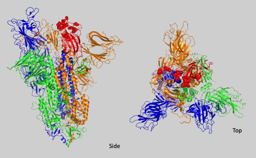 Figure 1: Structure of Spike Protein Showing Region of Receptor Binding Domain. The image is a ribbon diagram of a structure generated using cryo-electron microscopy (PDB ID 6zGG). Spike protein is a trimer (three monomers) shown in blue, green, and orange. The receptor binding domain of the green monomer is colored red and spheres represent sites mutated in Omicron (Some sites are also mutated in other variants).