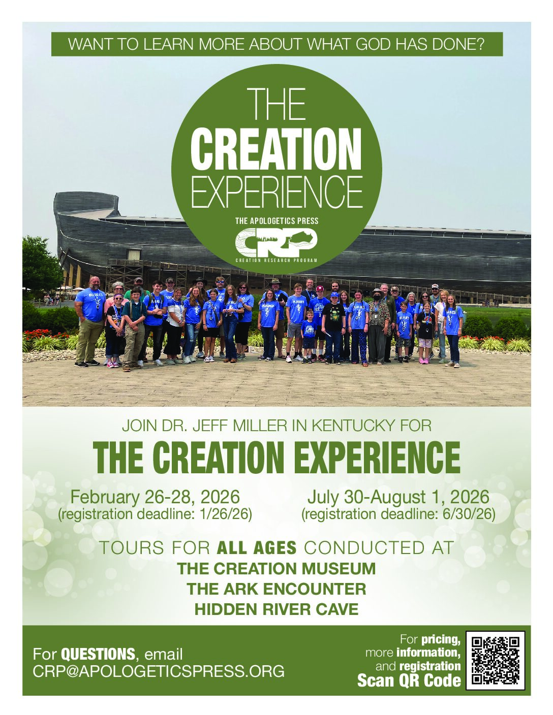 Dr. Jeff Miller, a qualified and experienced Creation scientist, conducts church tours of natural history museums, caves, and famous natural sites. He also guides tours at the popular Creation Museum and Ark Encounter in northern Kentucky, providing additional valuable information to help visitors more deeply understand and appreciate what they are seeing at those state-of-the-art facilities.
