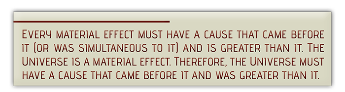 At one time in the past, the material Universe did not exist. Then, at some point, matter came into existence. But since matter is not eternal and cannot create itself from nothing, then something outside of the material realm must have brought matter into existence.