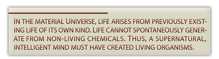In biology, one of the most widely recognized laws of science is the Law of Biogenesis. “Biogenesis” is composed of two words—“bio,” which means life, and “genesis,” which means beginning. Thus, this law deals with the beginning of life, and it simply says that in nature life comes only from previous life of its own kind. Over the years, the truthfulness of this law has been documented by thousands of scientists, most notably Louis Pasteur. His work dealt a crushing blow to the notion of spontaneous generation.