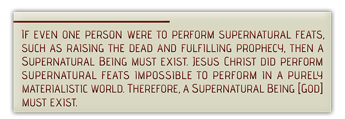 Atheists understand the rationality of this argument. Dan Barker once said on record, “If Jesus were to materialize” and work any number of miraculous deeds, atheism would be disproven (see Butt and Barker, p. 51), and thus theism would be established as a fact. The truth is, the very proof that Barker and other atheists request was provided 2,000 years ago when God put on flesh and came to Earth in the form of man. And He did not merely claim to be God; He did what a reasonable person could expect if God were ever to prove His divinity on Earth—He fulfilled precise prophecies and worked supernatural miracles, including coming back from the dead Himself. (For more information, see Butt and Lyons, 2006). The life and works of Jesus testify to the existence of a supernatural Being.